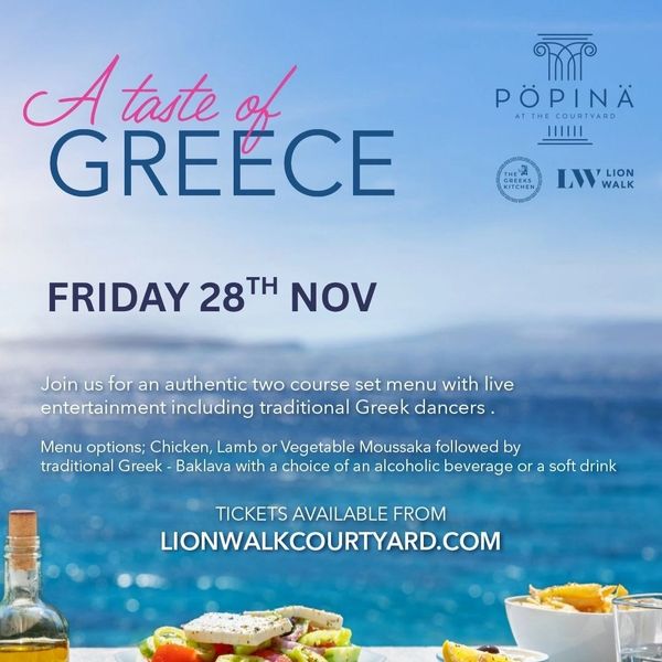 Transport yourself to a Mediterranean Christmas celebration at Lion Walk Courtyard with A Taste of Greece on Friday 28th November. As festive lights twinkle across the courtyard, guests will be treated to a warm and welcoming evening that blends the joy of the season with the spirit of Greece. Enjoy a freshly prepared two-course festive Greek menu, featuring your choice of Chicken, Lamb or Vegetable Moussaka followed by indulgent Baklava, complemented by a alcoholic beverage of your choice.